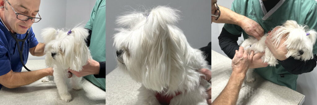 Ce chien femelle Bichon Maltais de 2 ans s’appelle Uzy. Il pèse 4,7 kg. Il était très revendicatif et aboyait abondamment lorsqu’il était à terre dans la salle de consultation. Puis une fois sur la table d’auscultation, on ne peut pas dire que notre demoiselle blanche immaculée était à l’aise. Elle haletait abondamment, ce qui traduisait son stress. Sa maîtresse essayait de la rassurer en lui parlant. Uzy est restée cependant très sage. Le Docteur Lamboy a effectué son travail avec beaucoup de délicatesse ; les vaccins contre la leptospirose et la rage n’ont pas pris trop de temps et n’ont pas semblé la perturber.